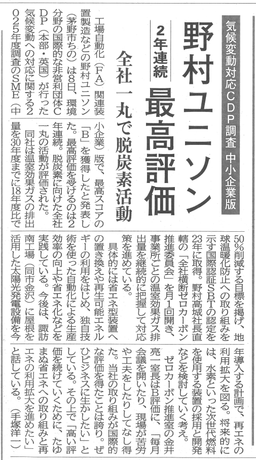 野村ユニソン株式会社は、国際的な非営利団体であるCDPによる2025 年度の気候変動に関する調査において、CDP2025コーポレートSME(中小企業)版の最高スコアである「B」を、前年に引き続き2年連続で獲得しました。引き続き、環境保護活動に向けた取組みや社会貢献活動を推進してまいります。▶野村ユニソン株式会社「サステナビリティ」※関連記事:長野日報